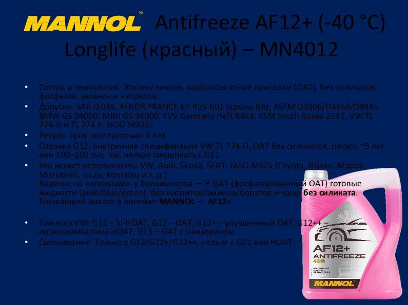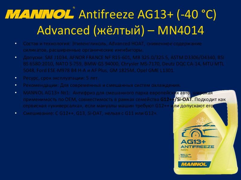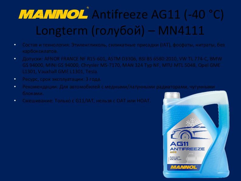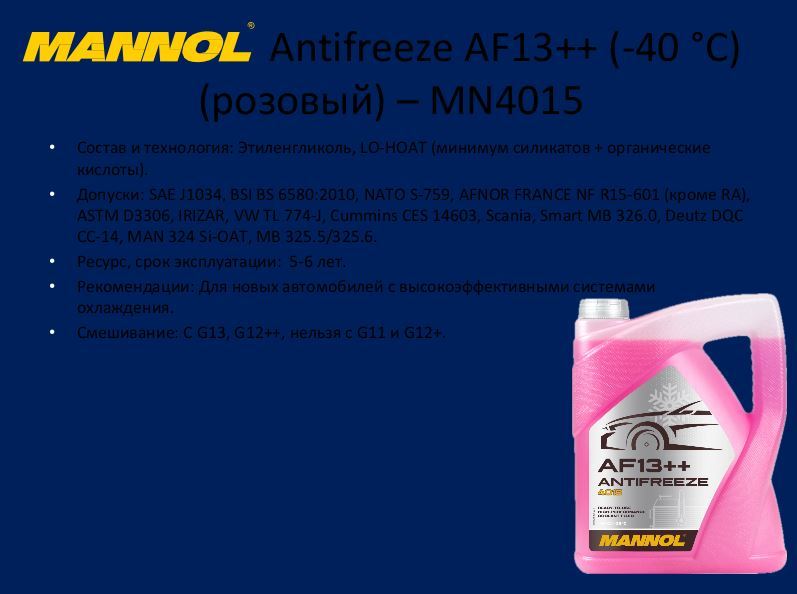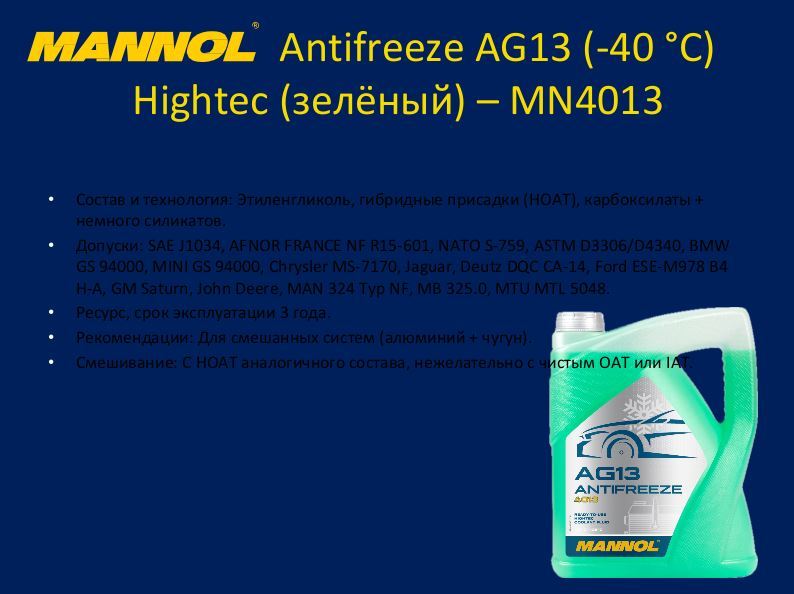 В-первых, это широкая линейка по технологиям и цветам. В отличие от многих брендов, MANNOL выпускает все типы жидкостей антифризов — от классических силикатных (G11) до современных лобридных (G13), что позволяет подобрать жидкость для практически любого авто.